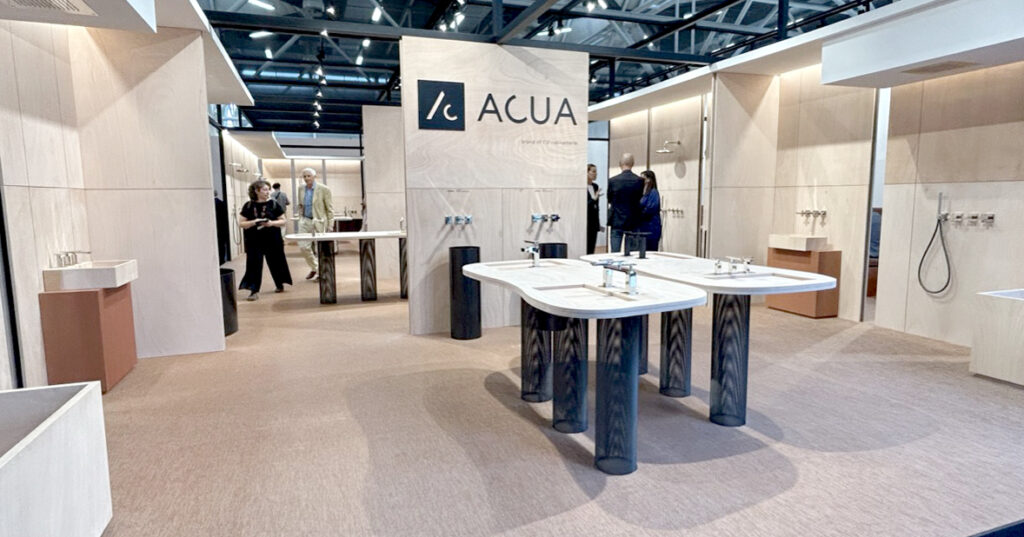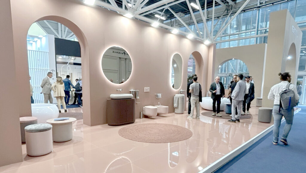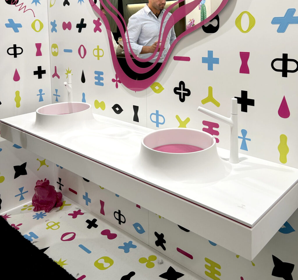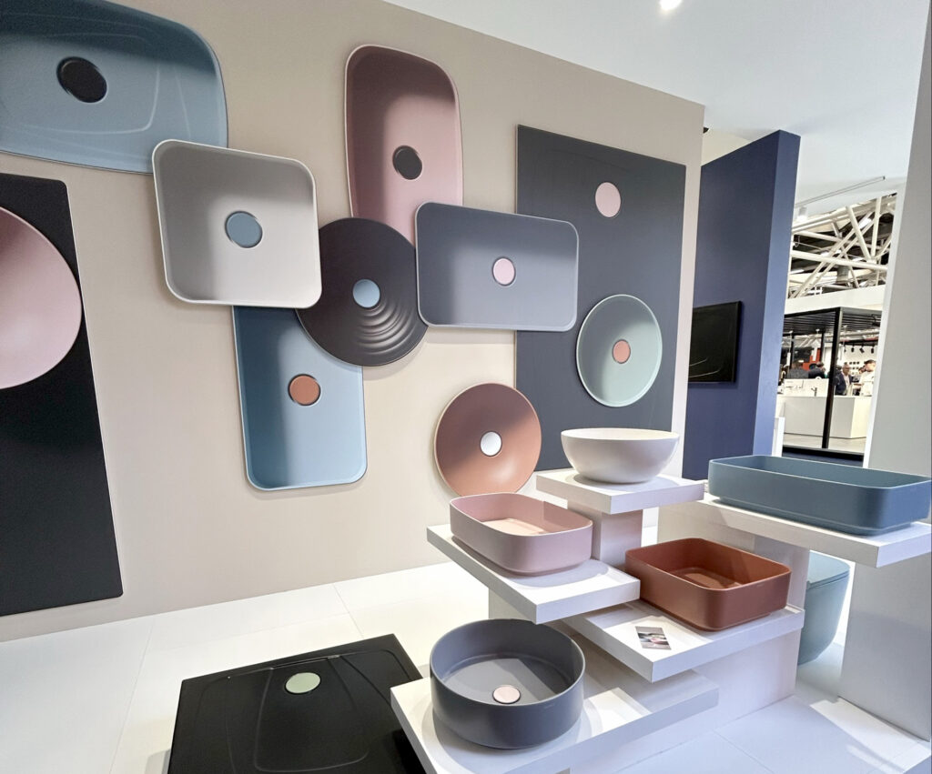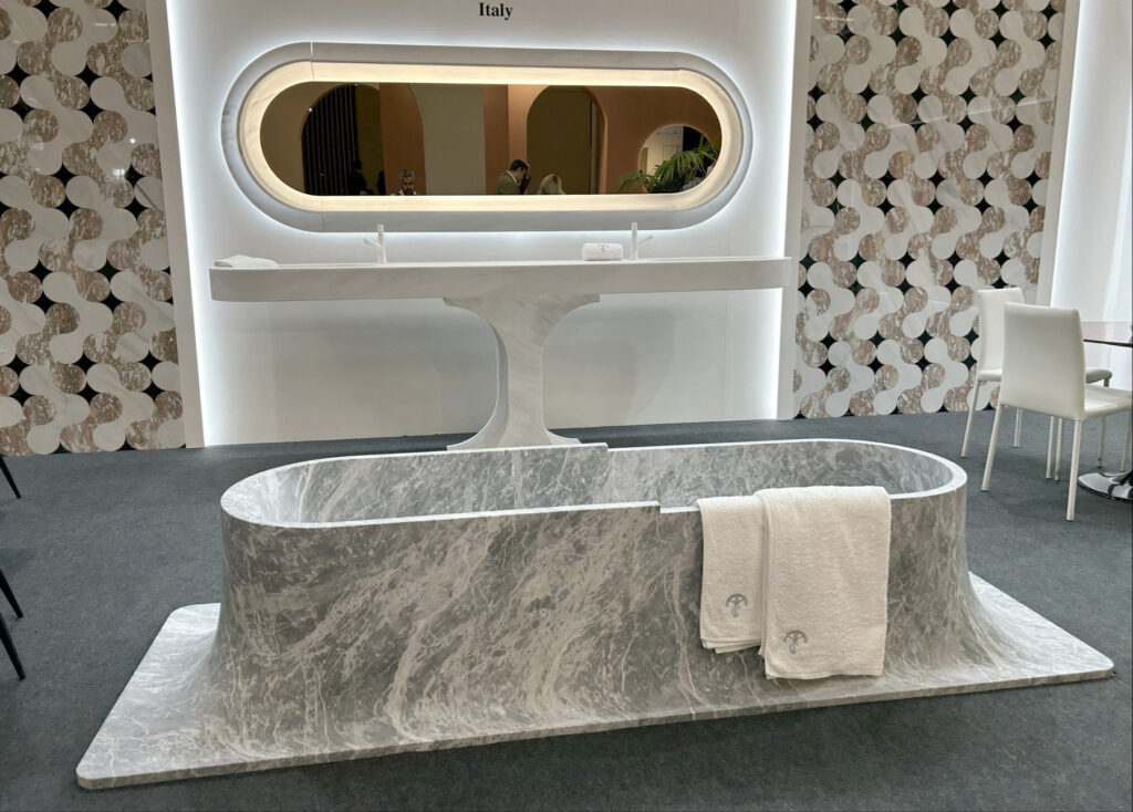 Yksi messujen vahvimmista uutuuksista oli keramiikan ja komposiittimateriaalien yhdistelmä – ratkaisu, joka on suunniteltu kestämään kulutusta ja tuomaan tilaan uudenlaista, miellyttävää tuntua. Mineraaleista ja puusta inspiroituneet, voimakkaasti syykuvioidut pinnat tuovat mieleen marmorin ja luonnonkiven, mutta hieman pehmeämmällä ilmeellä. Uritetut pinnat pesualtaissa, kylpyammeissa ja kalusteissa jatkavat vahvana trendinä.