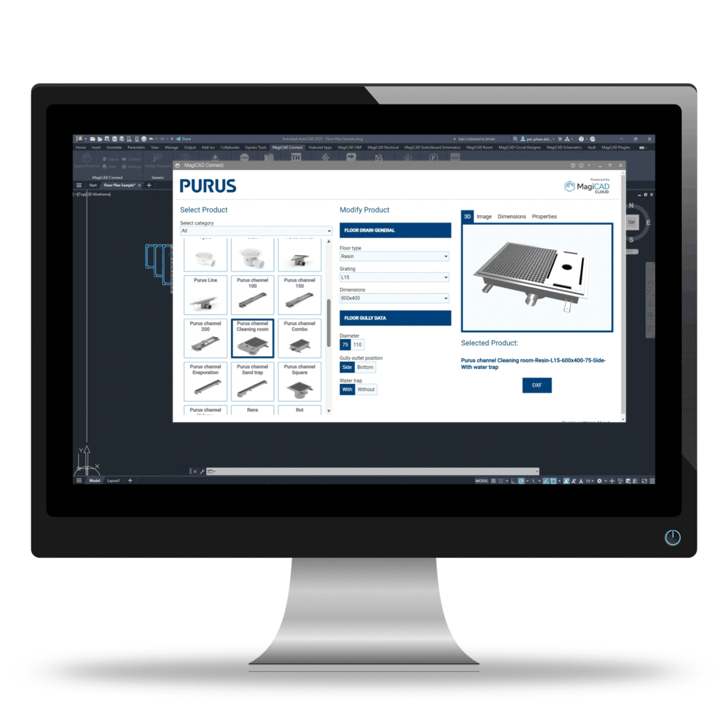 Yksi Purus ruostumattomien lattiakaivojen MagiCAD-valikoiman merkittävimmistä uudistuksista on mahdollisuus luoda useille tuotesarjoille 3D-objekteja räätälöidyillä mitoilla. Esimerkiksi Purus lattiakouru 100, 150 ja 200 voidaan räätälöidä sekä pituuden, että korkeuden osalta.